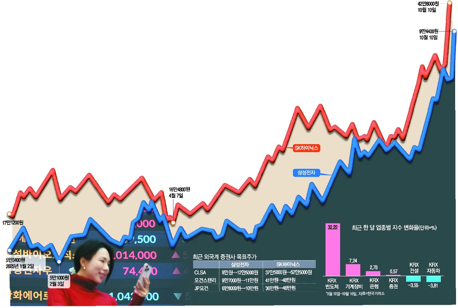 9월 이후 코스피200 지수가 26.23% 급등하는 동안, 삼성전자와 SK하이닉스는 유가증권시장 시가총액 증가액의 66%를 차지하며 압도적인 상승세를 보였습니다. 이는 투자 자금이 이들 두 종목에 집중된 결과로, 코스피200 동일가중 지수가 7.76% 상승에 그친 것과 대조적입니다. 외국인 투자자들은 이 기간 동안 삼성전자를 8조 9270억원, SK하이닉스를 8520억원어치 순매수했습니다.