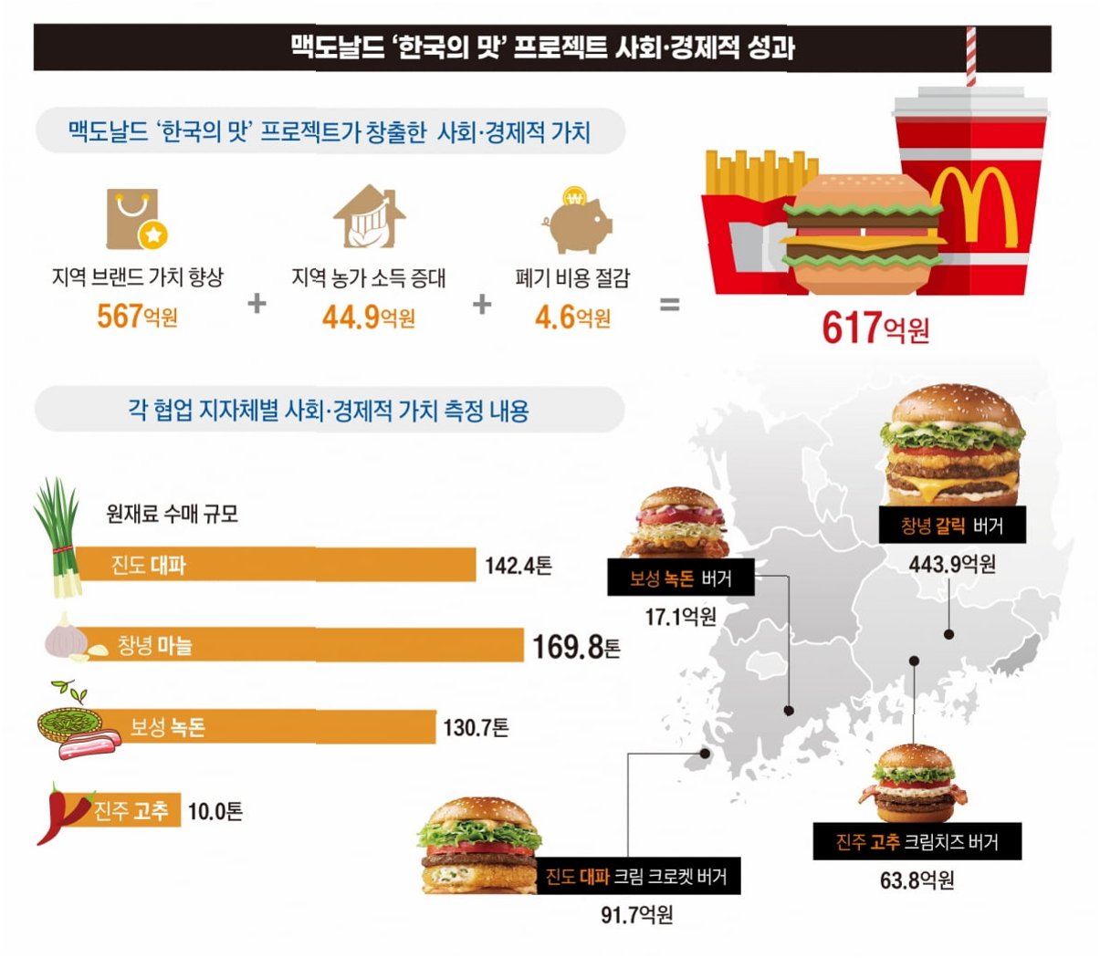 A.'한국의 맛' 시리즈는 지난 4년간 사회·경제적 가치 617억 원을 창출했습니다. 지역 브랜드 가치 향상 567억 원, 농가 실질 소득 증가 45억 원을 기록했으며, 창녕 갈릭 버거 재출시 3주 만에 150만 개 판매를 달성했습니다.