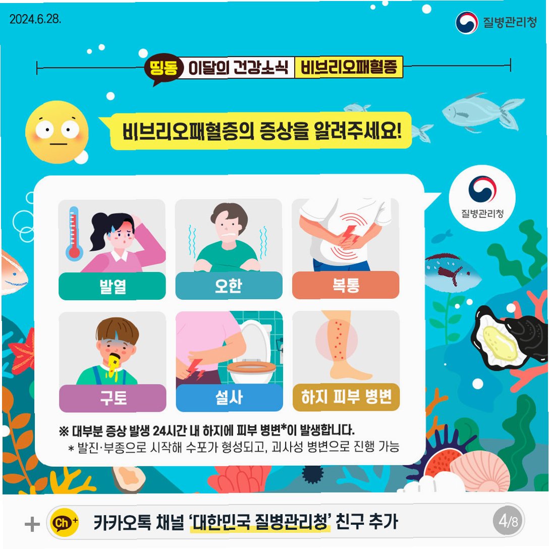 비브리오 패혈증은 감염 후 12~48시간 안에 증상이 빠르게 나타나는 것이 특징입니다. 갑작스러운 고열, 오한, 설사, 피부의 물집, 통증, 붓기 등의 증상이 나타난다면 즉시 의심해봐야 합니다. 특히, 기존에 상처가 있는 부위가 바닷물에 닿았을 경우, 더욱 주의 깊게 살펴보고 소독해야 합니다. 강북삼성병원 감염내과 주은정 교수는 “만성 간질환자, 당뇨병 환자, 면역저하자 같은 고위험군은 패혈증으로 이어질 가능성이 있으므로 즉시 전문의에게 치료받아야 한다”고 강조했습니다. 건강한 사람도 안심할 수 없지만, 특히 기저 질환이 있는 분들은 더욱 조심해야 합니다.