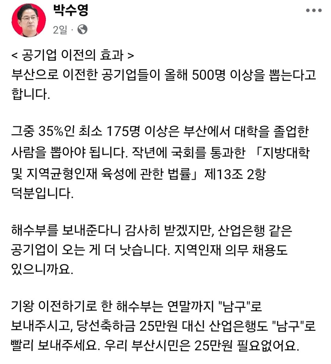 최근 박수영 국민의힘 의원(부산 남)이 자신의 SNS에 올린 발언이 논란의 중심에 섰습니다. 그는 ‘부산시민은 소비쿠폰 필요 없다’는 강한 어조의 글을 게시하며, 많은 시민들의 공분을 샀습니다. 이 발언은 국회에서 31조 8천억원 규모의 추경안이 통과되어 전 국민에게 소비쿠폰이 지급될 예정인 상황에서 나왔기에 더욱 주목받았습니다. 박 의원은 해수부의 남구 이전을 언급하며, 당선축하금 25만원 대신 산업은행을 남구로 보내달라고 요청했습니다. 하지만, 이러한 발언은 부산 시민 전체가 소비쿠폰을 원치 않는다는 오해를 불러일으킬 수 있다는 비판을 받았습니다. 이는 어려운 시기를 겪고 있는 자영업자와 시민들의 고통을 외면하는 것으로 비춰질 수 있다는 점에서 더욱 비판의 대상이 되었습니다.
