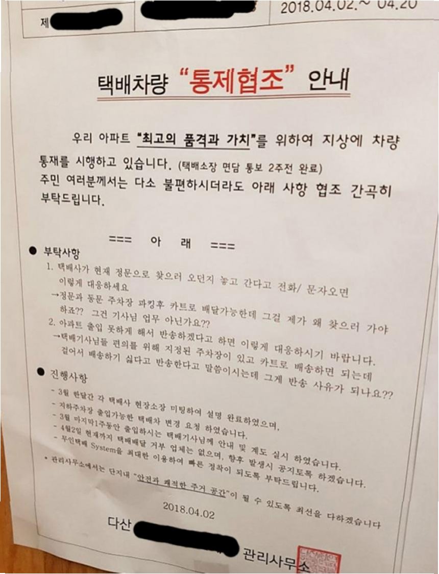 충북 청주의 한 아파트에서 택배 기사들에게 전달된 안내문이 온라인 커뮤니티를 뜨겁게 달구며 갑질 논란에 휩싸였습니다. 이 안내문은 입주민의 불편을 최소화하기 위해 택배 기사들에게 몇 가지 협조 사항과 금지 사항을 요구하고 있어, 그 내용의 적절성을 두고 다양한 의견이 오가고 있습니다. 특히, 새벽 배송 시 고층부터 배송할 것을 요청하는 내용과 출퇴근 시간대 배송 자제 요청은 갑질 논란의 핵심으로 떠올랐습니다.