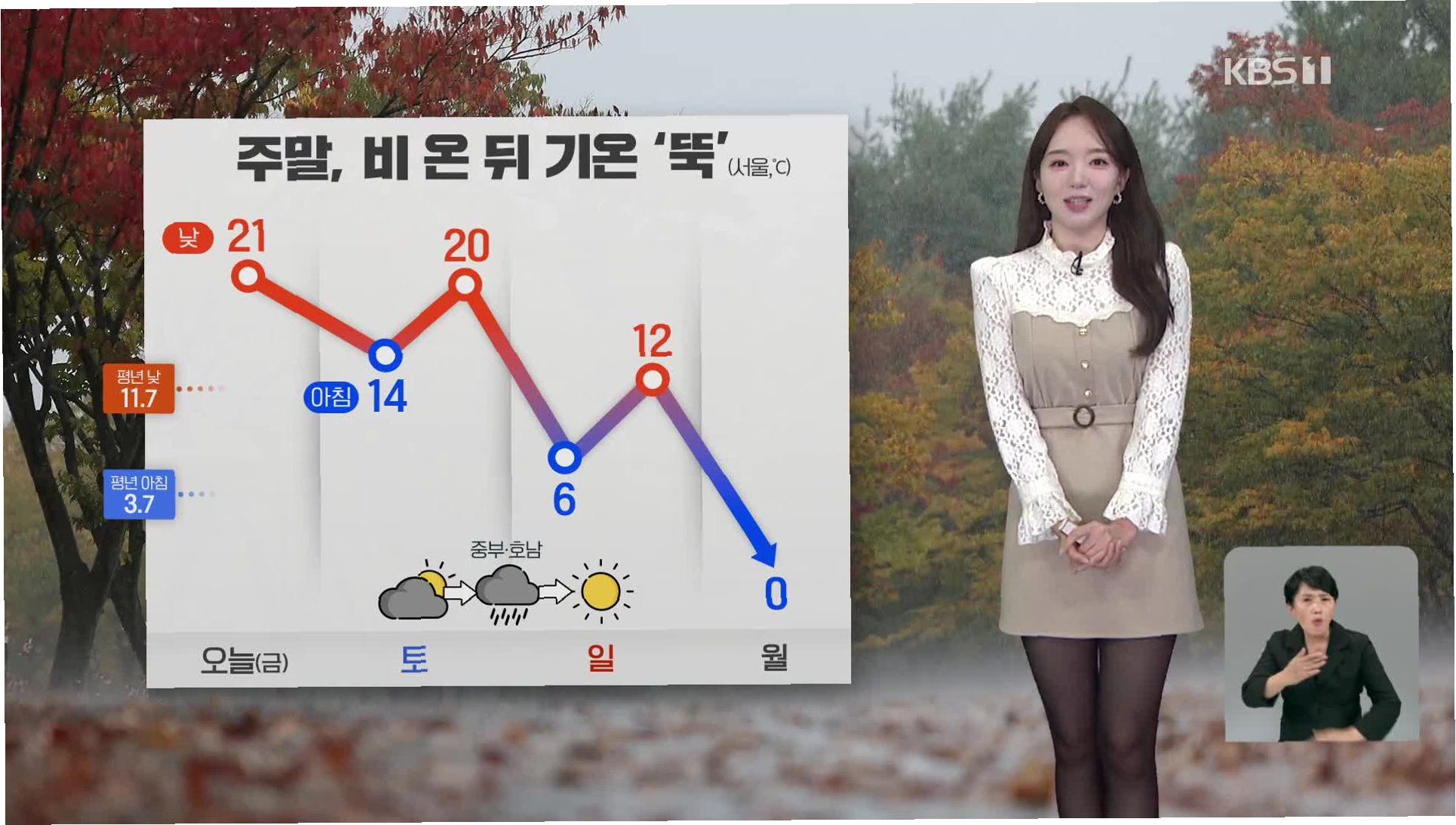 A.다음 주 월요일부터 기온이 큰 폭으로 떨어질 것으로 예상됩니다. 서울의 아침 기온은 일요일 11도에서 월요일 5도로 6도나 뚝 떨어질 것입니다.