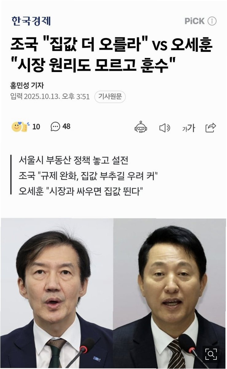 조국 조국혁신당 비상대책위원장은 오세훈 서울시장의 부동산 정책을 강하게 비판하며, '한강 벨트' 재건축 활성화 정책이 부동산 시장 불안을 심화시키고 서민과 청년의 주거 안정을 위협한다고 지적했다. 그는 오세훈 시장의 정책이 강남 편향적이며, 결과적으로 서울의 집값 상승을 부추기고 서민들의 주거 불안을 야기한다고 비판했다.