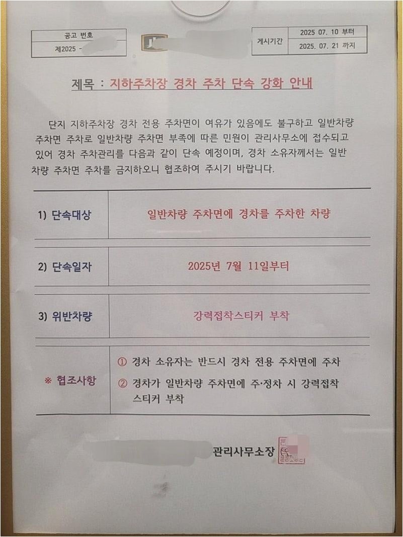 아파트 관리사무소는 왜 이러한 강경책을 선택했을까요? 안내문을 통해 알 수 있듯이, 그 배경에는 주차 공간 부족으로 인한 민원이 있었습니다. 특히, 경차 전용 주차면이 있음에도 일반 주차면에 주차하는 경차 때문에 일반 차량의 주차 공간이 부족해지는 상황이 발생한 것입니다. 아파트 측은 이러한 문제를 해결하기 위해 경차의 일반 주차면 사용을 제한하는 조치를 취하게 되었습니다. 하지만 이러한 조치가 과연 적절한 해결책인지에 대해서는 여전히 논란의 여지가 많습니다.