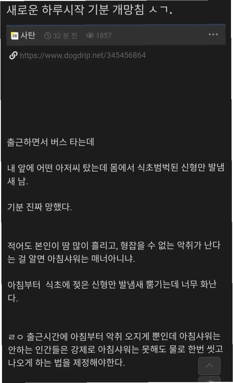 출근길 대중교통 이용 중 불쾌한 냄새로 인한 불편함을 호소하는 글이 온라인 커뮤니티에서 격렬한 논쟁을 불러일으켰습니다. 한 네티즌이 '아침 샤워 강제로 하는 법안을 만들어야 한다'는 내용의 글을 게시하면서, 찬반 의견이 팽팽하게 맞서고 있습니다. 이 글은 다른 커뮤니티의 게시물을 캡처한 것으로, 냄새로 인한 불쾌감을 직접적으로 표현하며 공감을 구하려 했습니다.