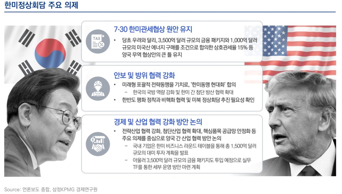 현재 한미 양국은 7월 큰 틀에서 무역합의를 했을 때 한국이 하기로 한 3천500억달러 대미 투자 패키지의 구성과 이행 방안 등을 두고 접점을 찾는 데 어려움을 겪고 있다. 김정관 산업통상부 장관은 국정감사에서 한국이 매년 250억달러씩 8년간 총 2천억달러의 대미 투자를 하는 방안이 논의되고 있느냐는 질의에 "그런 논의가 있다"고 확인했다. 그러나 김 장관은 대미 현금 투자 규모 등과 관련해 "어느 정도가 적절한 수준인가 놓고 (한미) 양 파트가 굉장히 대립하고 있다"고 밝혀, 합의 도출까지 난항이 예상된다.