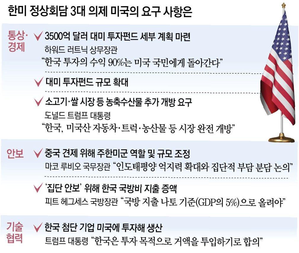 A.가장 큰 쟁점은 한국의 대미 투자 규모와 이행 방안입니다. 양국은 3,500억 달러 규모의 투자 패키지에 대한 세부 사항을 조율 중입니다.