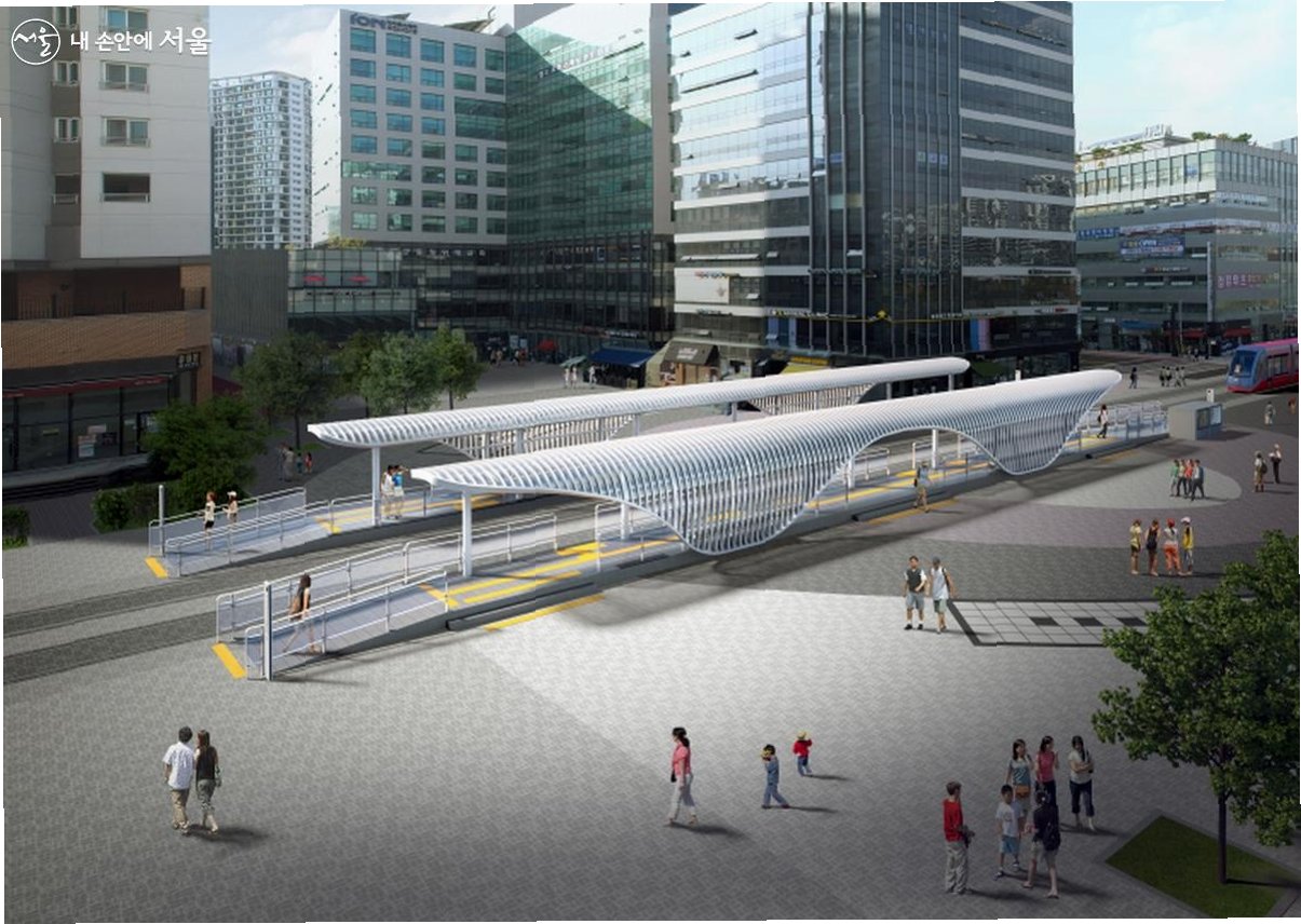 최근 위례중앙광장 107번 트램 정거장에서 마무리 공사가 한창 진행 중이다. 전차 노선은 아파트와 상가 사이로 길게 뻗어 나갔다. 레일은 도로에 홈을 파 설치되어 휠체어나 이동약자도 편리하게 이용할 수 있도록 설계되었다.