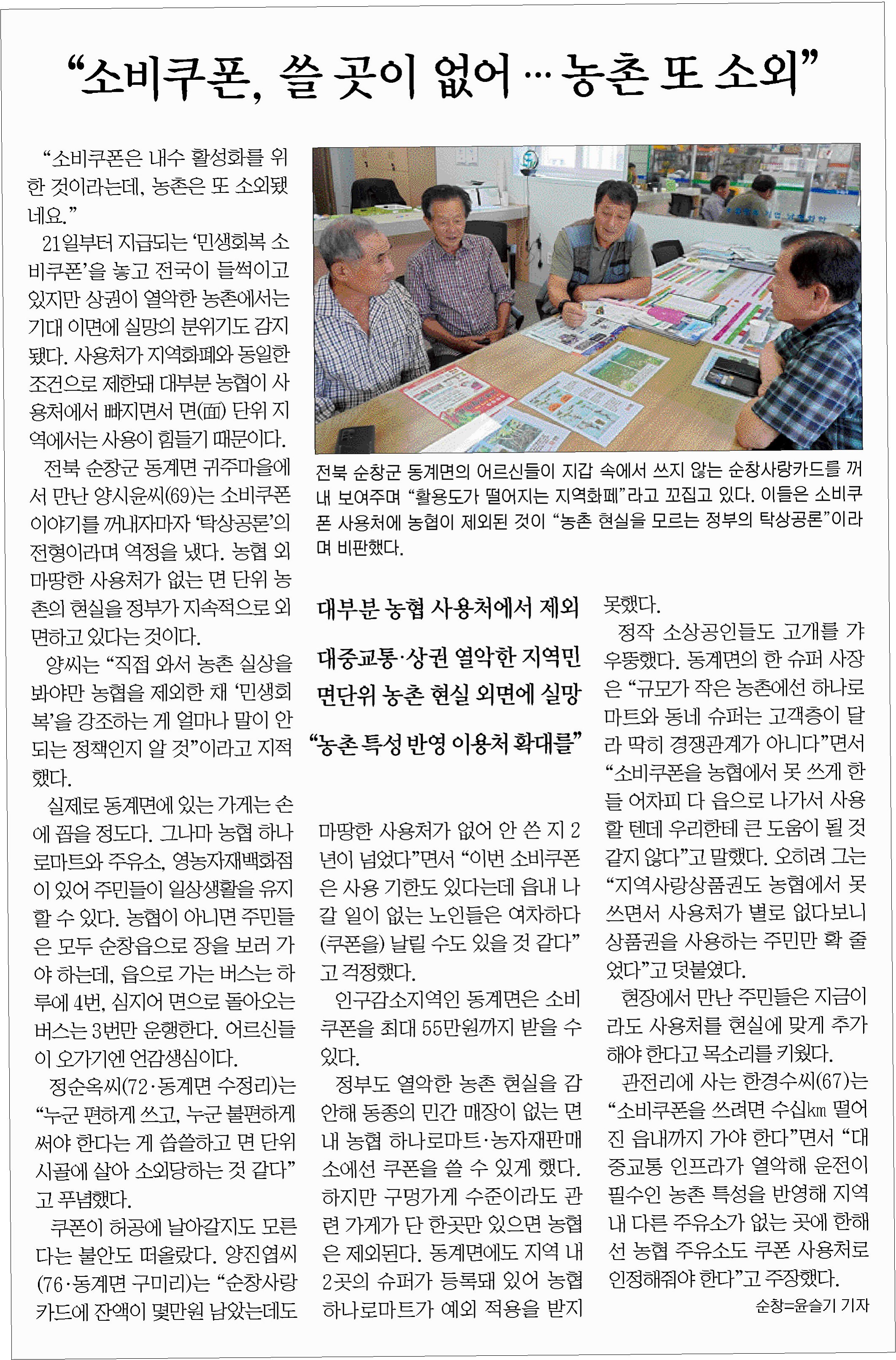 침체된 경기를 회복하고 민생을 안정화하겠다는 취지로 정부가 지급하는 ‘민생회복 소비쿠폰’이 정작 상당수 농촌주민에게는 무용지물일 수 있다는 우려가 현실화하고 있다.