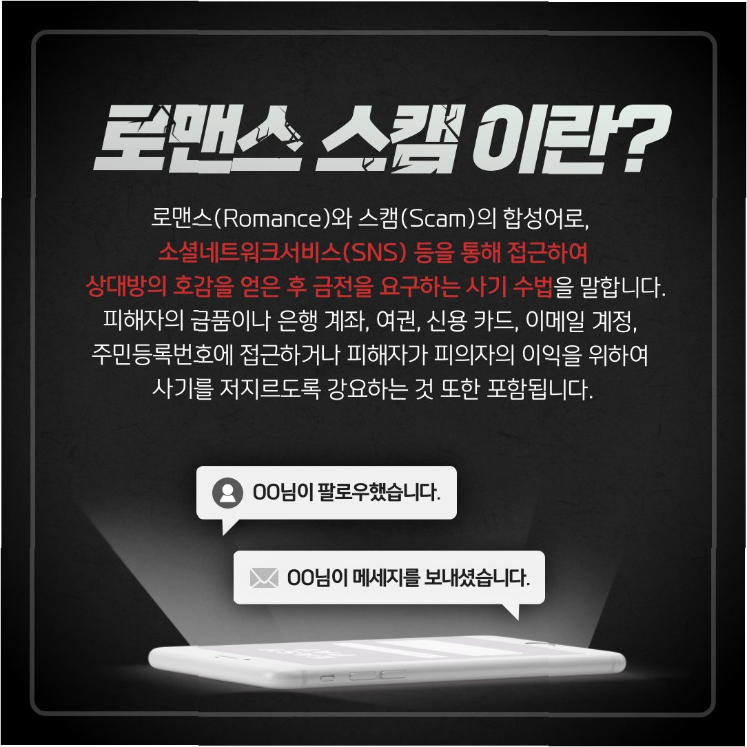 A.로맨스 스캠은 사랑을 가장하여 피해자에게 접근, 신뢰를 쌓은 뒤 금전을 요구하는 사기 수법입니다. 주로 SNS, 데이트 앱 등을 통해 이루어지며, 외국인이나 유명인을 사칭하는 경우가 많습니다.