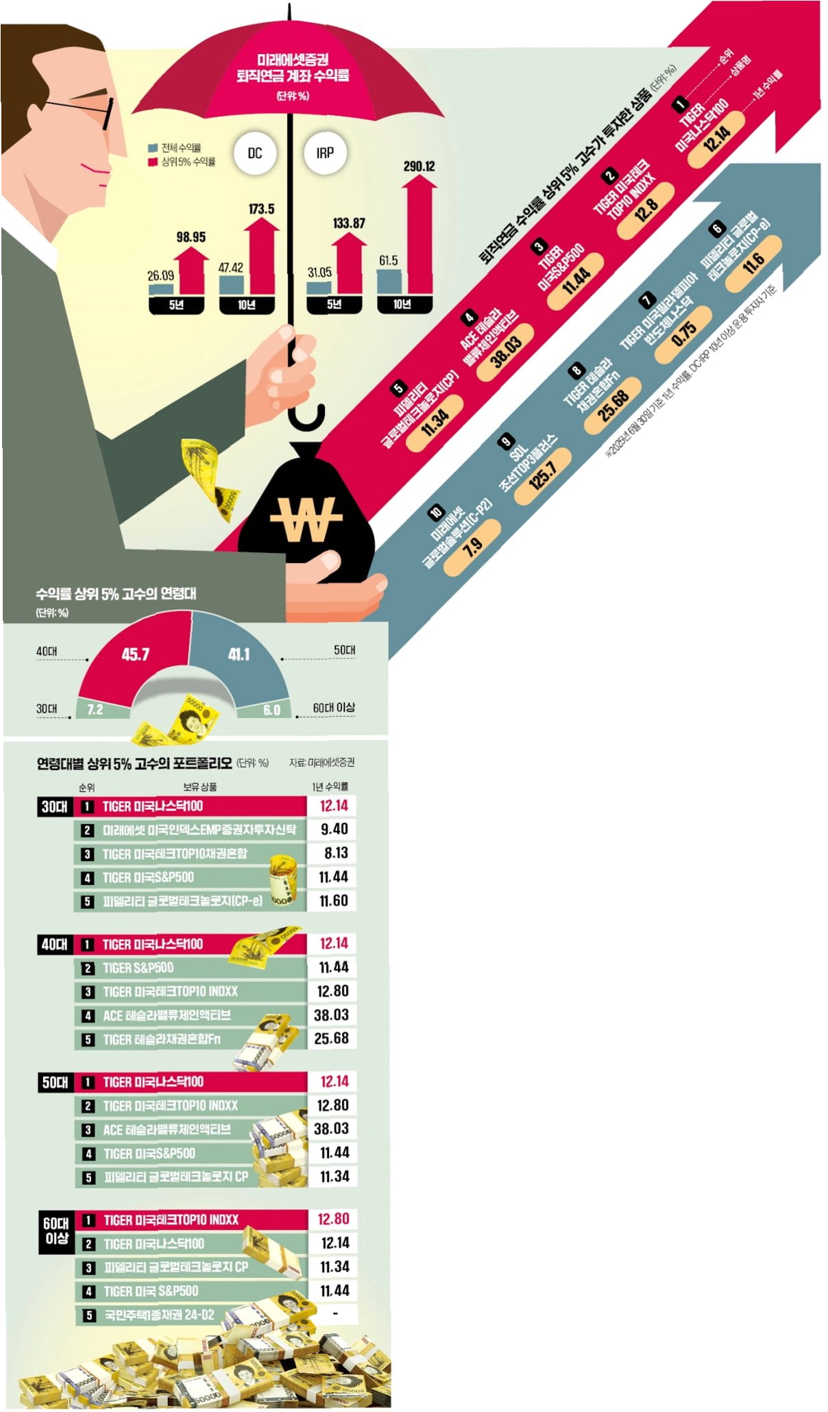 A.DC/IRP형 퇴직연금, ETF, TDF 등을 활용하여 적극적인 투자를 고려해볼 수 있습니다. 3040은 공격적인 투자를, 5060은 안정적인 인컴소득 확보에 집중하는 것이 좋습니다.