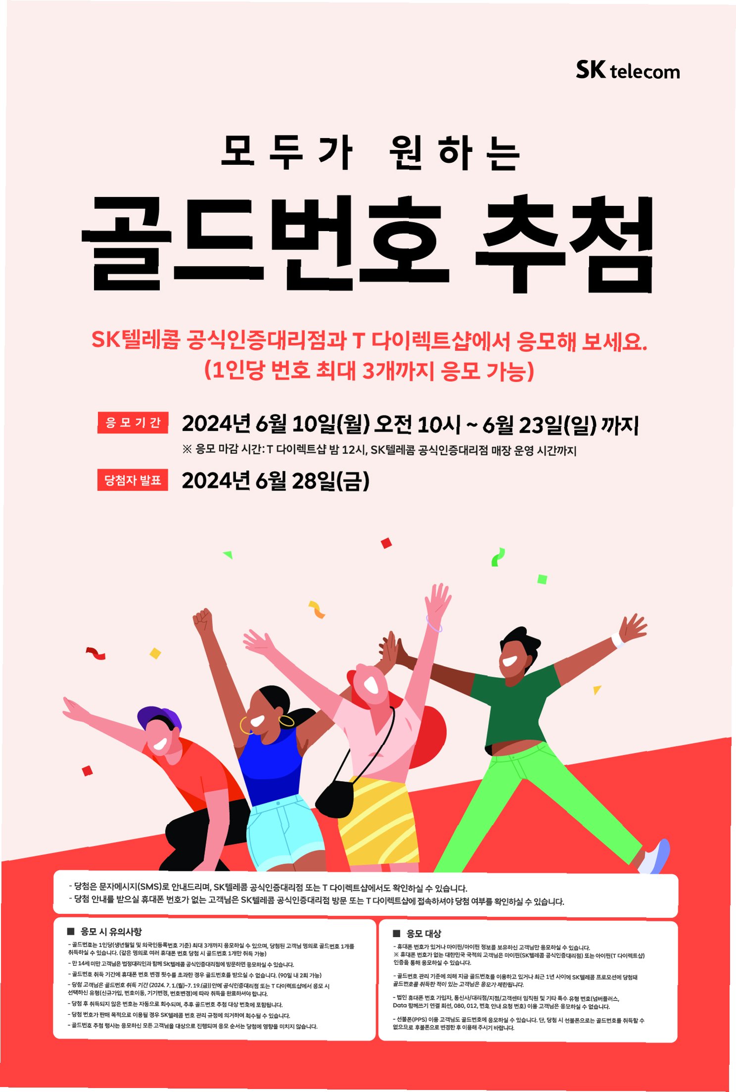 골드번호 신청은 23일까지 진행되며, 당첨자는 27일에 발표될 예정입니다. 신청 방법은 간단하며, SK텔레콤 공식 인증 대리점 또는 T다이렉트샵을 방문하여 안내에 따라 진행하면 됩니다. 알뜰폰 가입자의 경우, 해당 통신사의 안내에 따라 신청 절차를 따르면 됩니다. 당첨 결과는 개별적으로 통보될 예정이며, 당첨된 골드번호는 추후 사용하게 될 전화번호로 등록됩니다. 이번 프로모션을 통해, 오랫동안 기억될 특별한 번호를 갖게 되시기를 바랍니다.