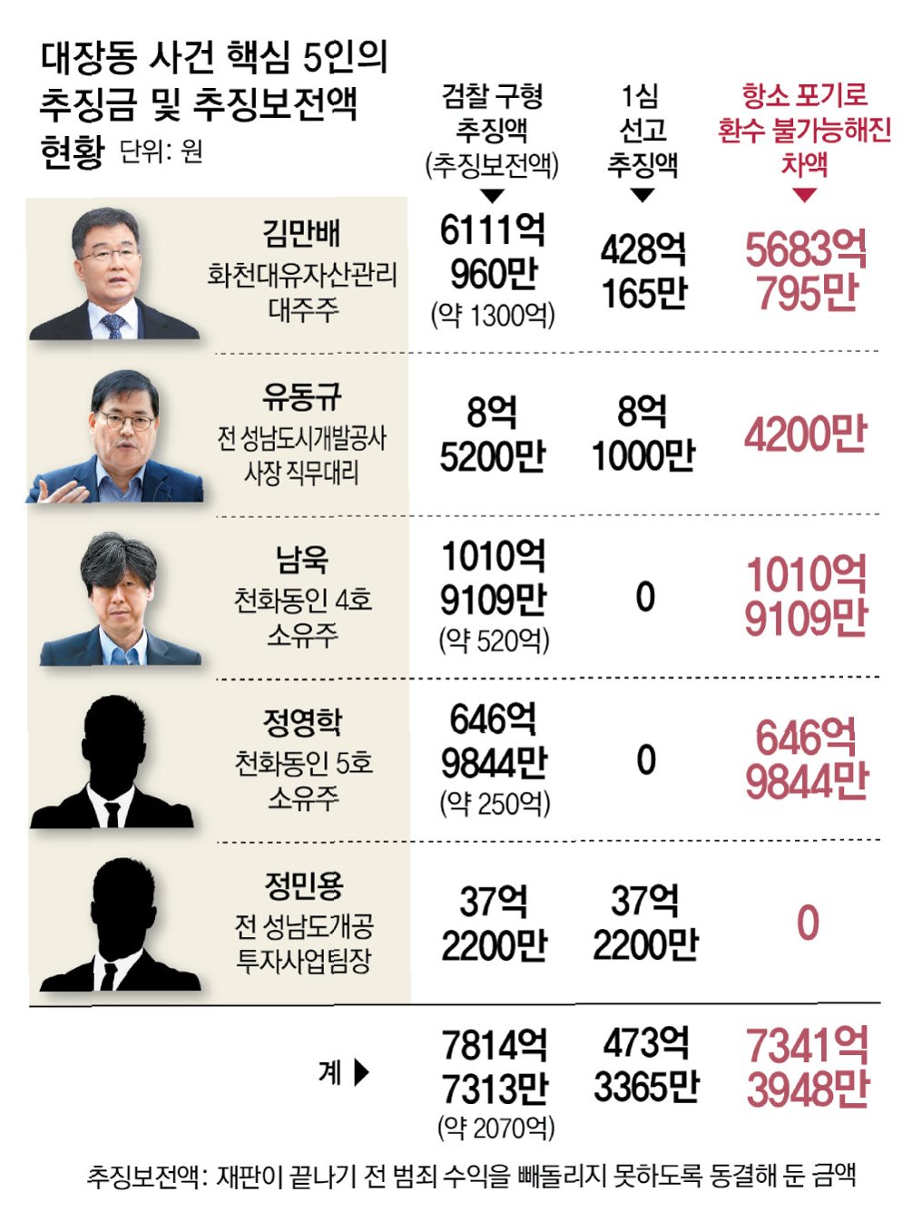 정영학 회계사는 600억 원 대 자산이 묶여 있으며, 항소심 결과를 기다리고 있습니다. 김만배 씨는 1심에서 추징금이 선고되어 재판을 기다려야 하는 상황입니다. 검찰이 추징금 미선고된 이들에 대해 재산 압류 해제를 신청하면, 법원은 심리 후 이를 허가할 수 있습니다. 대장동 사건 관련자들의 재산 상황은 앞으로의 재판 결과에 따라 크게 달라질 수 있습니다.