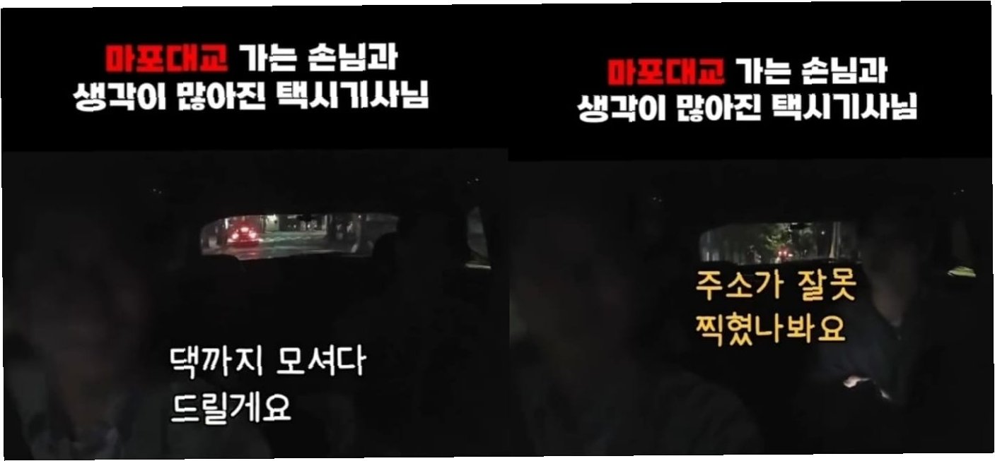 A.승객이 택시 호출 앱에서 목적지를 잘못 설정하여 마포대교로 향하게 되었고, 기사는 승객이 힘든 상황에 처했을 수도 있다고 생각하여 요금을 받지 않고 집으로 데려다주기로 했습니다.