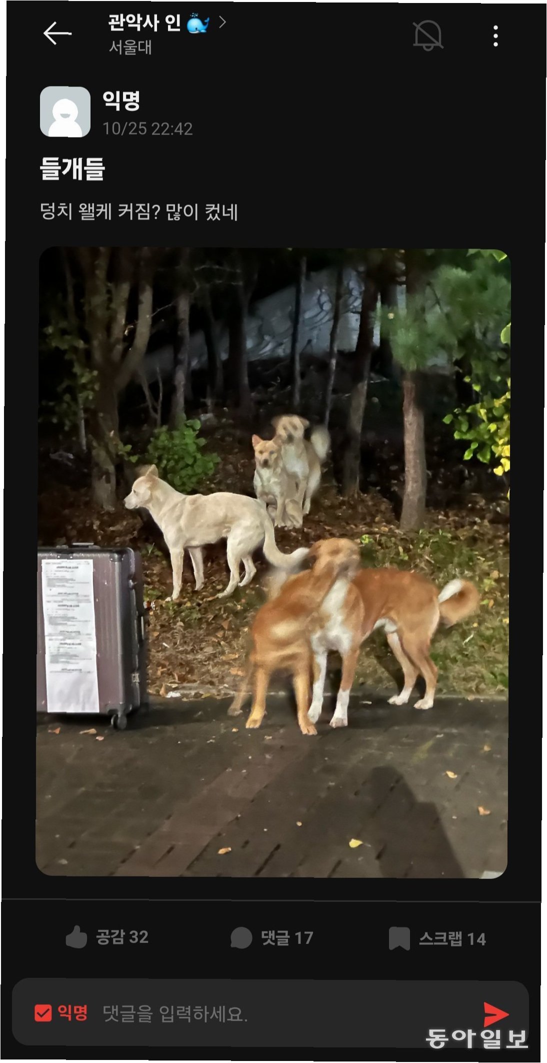 서울대 기숙사에 거주하는 박진우 씨는 “산책할 때마다 들개 떼를 마주친다”며 “사람을 보면 일부러 다가오는 듯한 개체도 많아서 긴장을 놓을 수가 없다”고 말했습니다. 이러한 증언들은 서울대 구성원들이 일상생활에서 느끼는 불안감을 생생하게 보여줍니다.