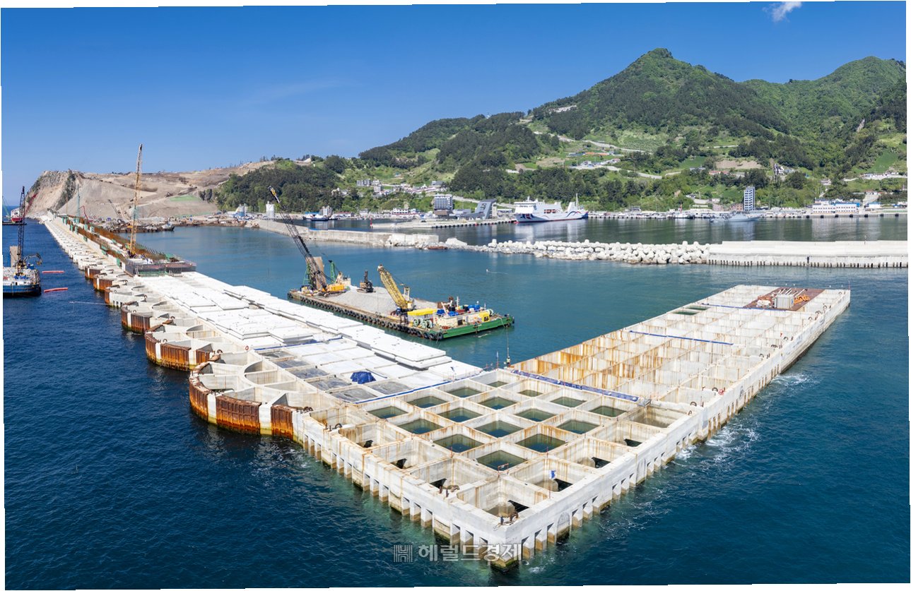 울릉공항 건설 현장은 첨단 기술의 집약체입니다. 특히, 평균 수심 23m, 최대 31m에 달하는 깊은 바다를 메우는 해양매립공사가 눈길을 끕니다. 이 과정에서 항만공사에 주로 사용되는 케이슨 공법이 최초로 도입되었습니다. 아파트 12층 높이의 초대형 케이슨 30함이 설치되어 강력한 방파제 역할을 수행하며, 태풍 '마이삭'의 위력에도 끄떡없는 튼튼한 지반을 구축할 예정입니다.
