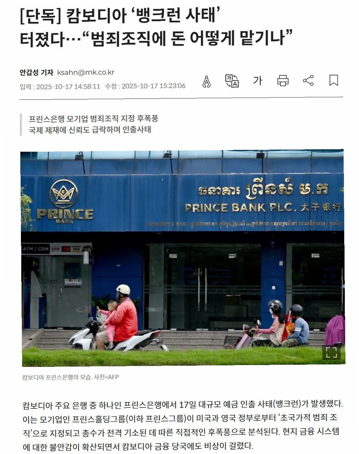 A.모기업인 프린스홀딩그룹이 미국과 영국 정부로부터 ‘초국가적 범죄 조직’으로 지정되고, 총수가 기소된 것이 직접적인 원인입니다. 이로 인해 예금주들의 불안감이 커져 대규모 예금 인출 사태가 발생했습니다.