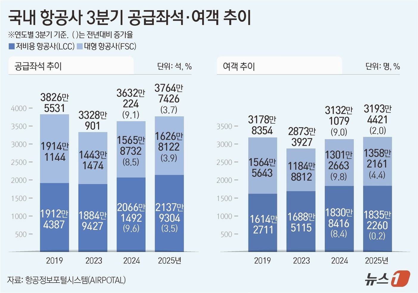 공항은 역대 최대 인파로 북적이는데 항공사는 역대급 ‘실적 쇼크’에 휘청이고 있습니다. 국내 주요 항공사들이 일본·동남아시아 등 인기 단거리 노선에만 지나치게 공급을 늘려 과당경쟁이 부메랑이 되면서 주가 역시 힘을 쓰지 못하고 있습니다. 여행객 증가는 역대 최대치를 경신했지만, 항공사 실적은 감소하는 기이한 현상이 벌어지고 있습니다. 대한항공은 3분기 영업이익이 39% 급감했고, 아시아나항공은 적자 전환했습니다. 저비용항공사(LCC)들의 실적 부진은 더욱 심각한 상황입니다.
