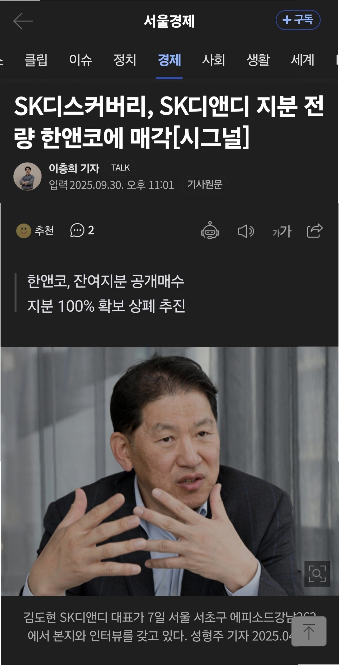 사모펀드 한앤컴퍼니(한앤코)가 SK디앤디의 지분 인수에 이어 상장폐지를 예고하면서, SK그룹과의 결별이 기업 신용에 어떤 영향을 미칠지 이목이 집중되고 있습니다. 최대주주가 사모펀드로 변경됨에 따라 SK그룹의 지원을 기대하기 어려워진 상황에서, SK디앤디의 회사채 신용등급이 하락할 가능성이 제기되고 있습니다. 한앤코 체제 전환 이후 재무 정책 방향과 사업 구조 변화가 향후 신용도에 중요한 영향을 미칠 것으로 보입니다.